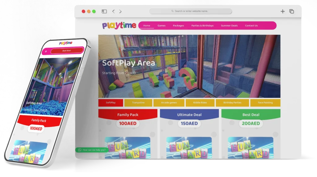 Kid-friendly UAE play area website showcasing packages, events and promos with vibrant UI, built scalable for future online booking and purchases.
